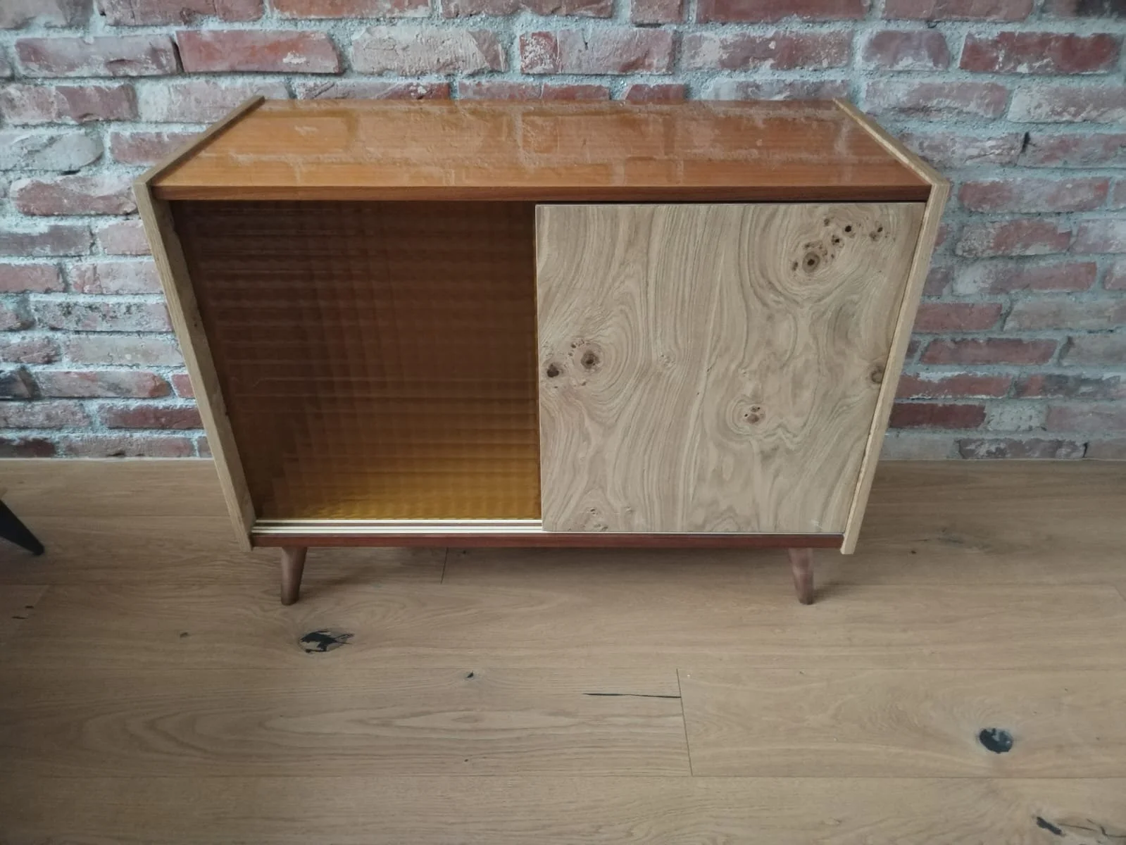 This handcrafted reYUsed cabinet is an original piece of sustainable, upcycled furniture. Almost all its components come from old 1980s wardrobes that once filled homes across the former Yugoslavia. Only the slides and legs are new; the rest has been carefully restored and repurposed.